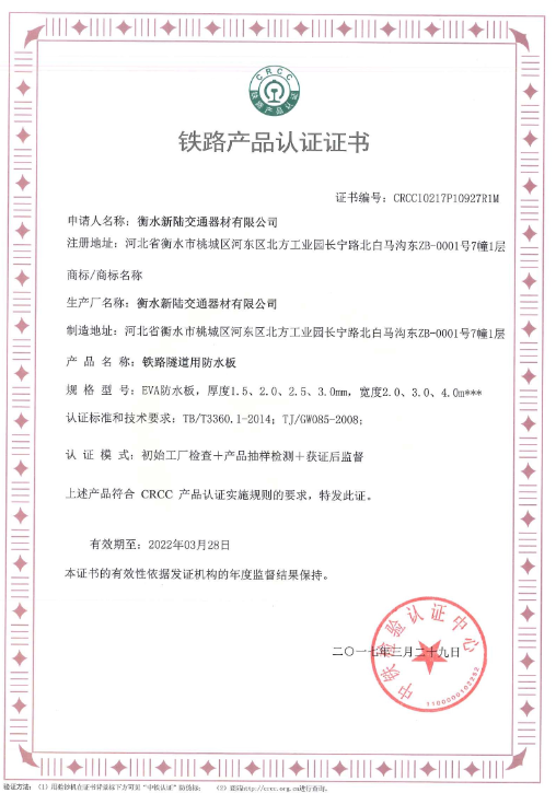 我公司產(chǎn)品經(jīng)中鐵檢驗(yàn)認(rèn)證中心(原中鐵鐵路產(chǎn)品認(rèn)證中心)(簡稱“CRCC”)一系列檢驗(yàn),產(chǎn)品質(zhì)量過硬完全達(dá)到鐵路產(chǎn)品、城軌裝備要求,現(xiàn)已順利獲得CRCC證書。后附防水板、止水帶CRCC證書詳情。